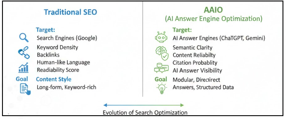 AI answer engine optimization (AAIO) focuses on optimizing content for AI-driven search and citation systems rather than traditional SERPs alone.