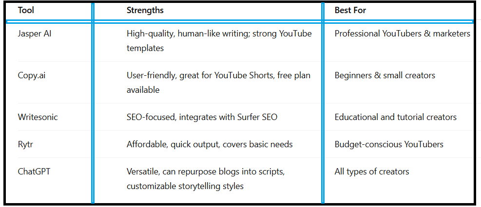 Whether you’re making tutorials, vlogs, or YouTube Shorts, tools like Jasper, Writesonic, Copy.ai, and Rytr provide an edge in a competitive landscape. By combining AI efficiency with your unique personality, you can create scripts that captivate viewers and grow your channel.