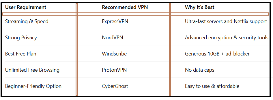 For Free Usage → Windscribe and ProtonVPN are solid picks.