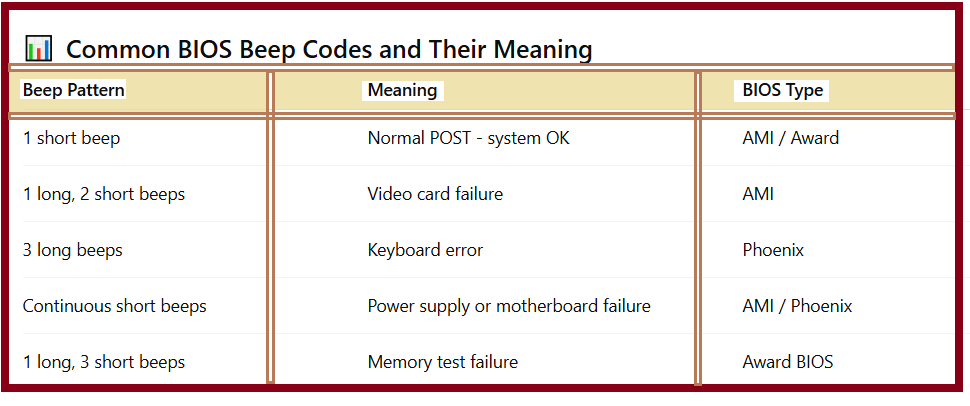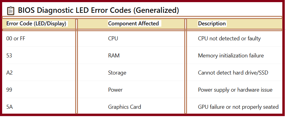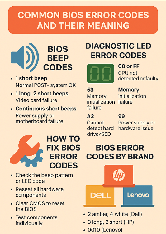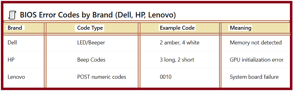 Even brands like Dell, HP, and Lenovo use manufacturer-based beep and LED code systems. For example, Dell BIOS error codes often display numbers on the power LED, while HP BIOS beep codes may combine beeps and flashes.