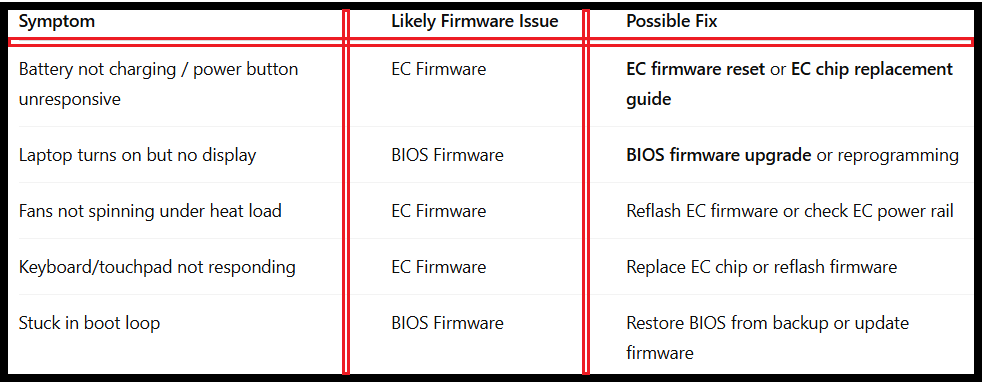 Without proper coordination, hardware issues like battery not charging, fans not spinning, or even complete boot failure can occur.