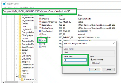 1.Simply change the value of the Start DWORD to 4 in the CscService key (steps 7 and 8).