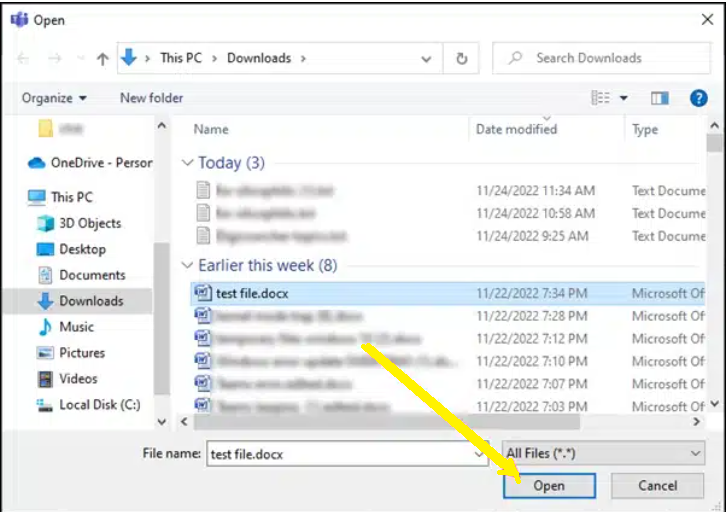 4.From the file location, choose the file and click on the Open button to attach it.