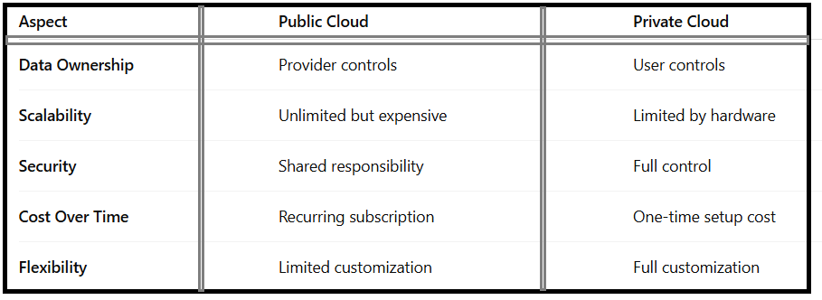 A private cloud server gives you full ownership of your data, while public clouds rely on third-party providers.