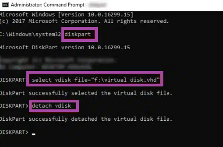 b) select vdisk file=“f:\virtual disk.vhd” . Press Enter (the “f” represent the name of the virtual disk)