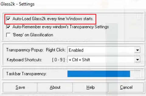 4.After opening Glass 2k, check the Auto-Load Glass 2k every time Windows starts box.