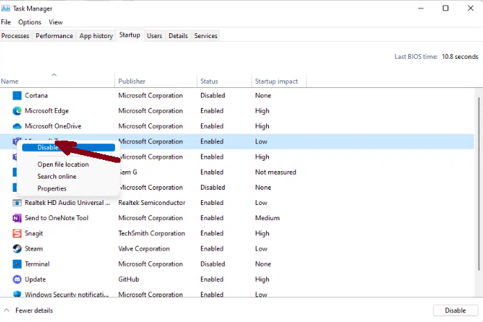 10.Click on Startup and right-click on the unnecessary apps.