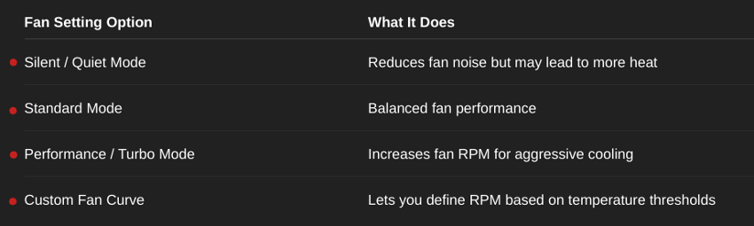 If available, choose Performance Mode or custom fan curve to increase cooling. This helps with laptop thermal management and ensures active airflow under heavy load.