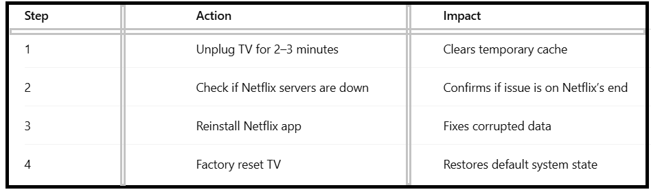 If none of these work, check if Netflix servers are down globally. You can also contact your TV manufacturer’s support team or Netflix customer service for advanced troubleshooting.