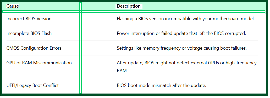 Understanding the possible reasons can help in choosing the best method for recovery. Below is a breakdown of the most common culprits of PC not booting after BIOS update: