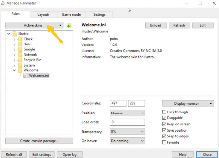 4.You’ll see the list of Installed Rainmeter skins under Active skins.