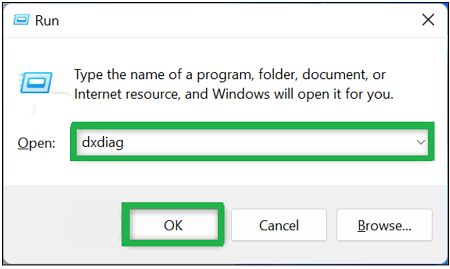 3.Type ‘ dxdiag ‘ command and press Enter or OK.