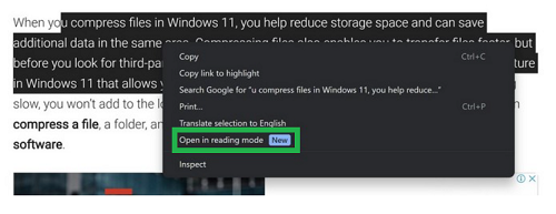 You will see all the text on the site without ads and images in the Reading Mode. All the distracting items will go away. The text won’t go away even if you switch to another tab while using the Reading mode. You can even have the site on one side and only the text on the other side.