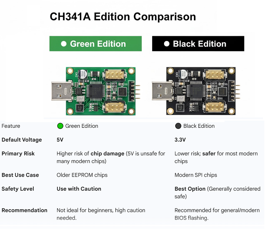 The black edition is generally considered is CH341A safe for BIOS flashing due to its safer voltage output.