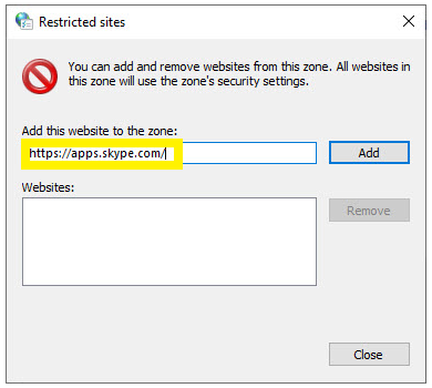10.Type the command given below in the Add this website to the zone section to remove Skype ads: