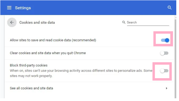 6.Enable the Allow sites to save and read cookie data (recommended) toggle.