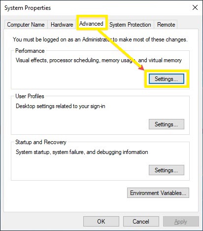 3.Next, select the Advance option from the top. Then, click on settings button in the performance section.