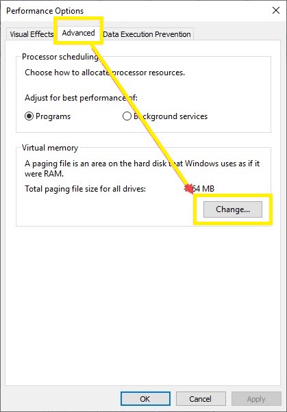 4.Select the Advanced tab. Click on the Change option in the Virtual memory section.