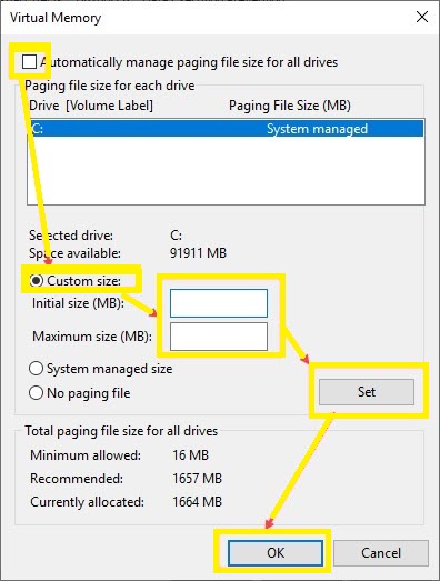 5.Now, you will see the ‘Automatically manage paging file size for all drives‘ on the top. Uncheck this option. Then, check the ‘custom size‘ option.