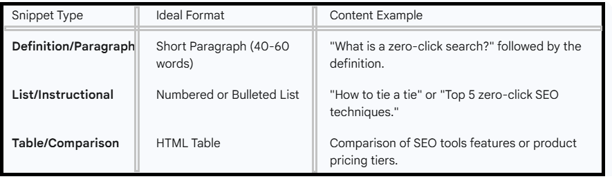 Featured Snippets (Position Zero)Provide clear, concise, and structured answers (paragraphs, lists, or tables) early in your content that directly address user questions.